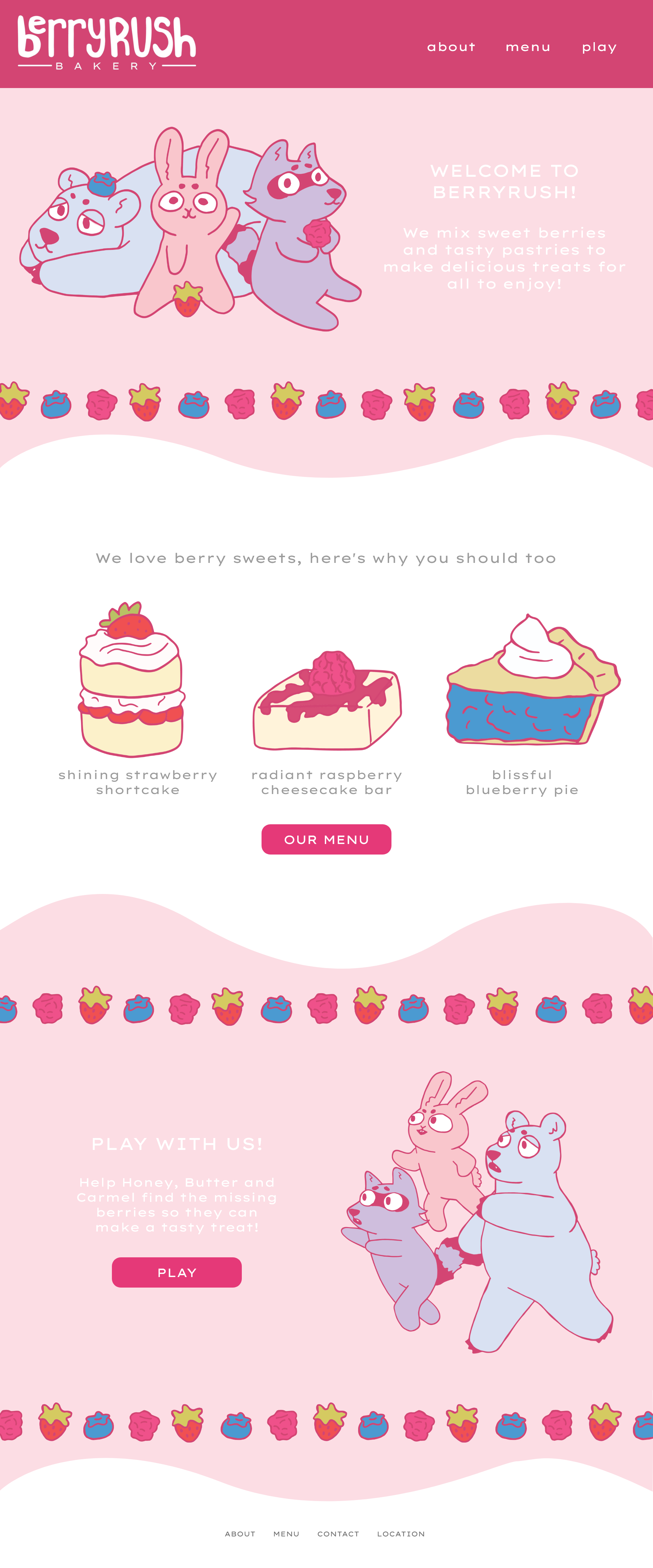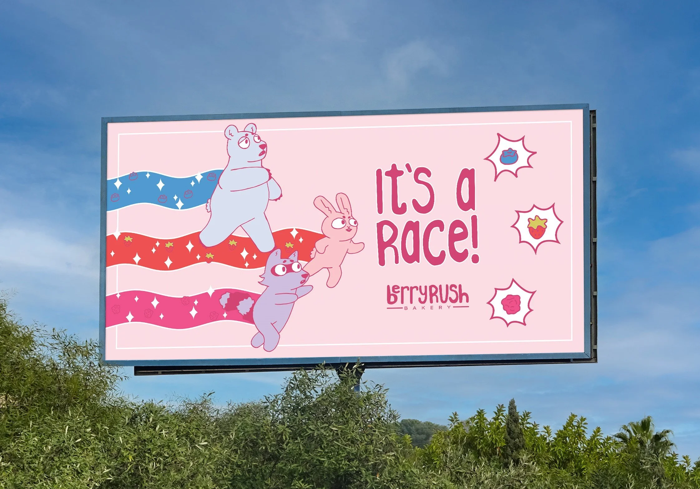 In need of a fresh fruity baked good? Look no further than Berry Rush! This brand was built from the ground up and started with loveable fruit themed mascots. When you walk into the bakery, you can tell from décor to package design that berries are a crucial part of our branding. To announce Berry Rush to the world, out of home advertising was used. Billboards, bus shelters, and bus wraps all directed viewers to ‘rush’ on over! The website was designed to attract customers from far and wide; as well as include a game based on the mascots for some more berry themed fun! When all these design elements come together, one really gets the feeling of this cute, fun and tasty new bakery.