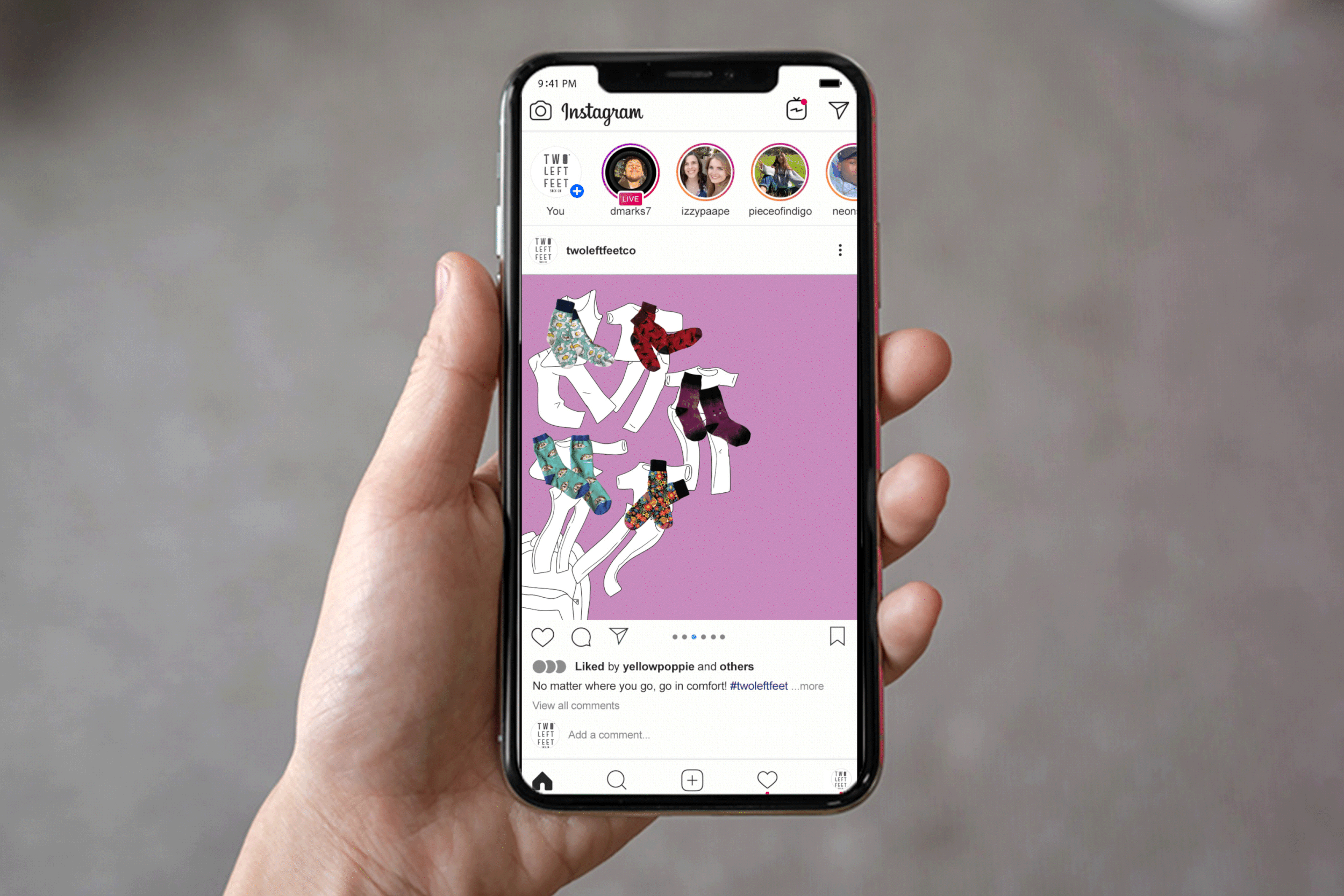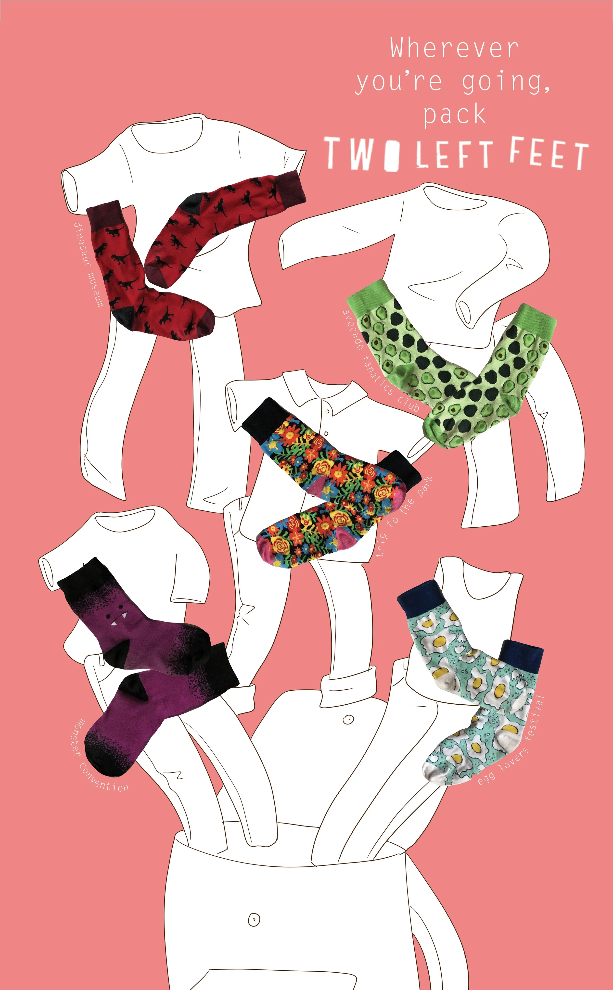 Two Left Feet is an apparel company that really allows your silly side to shine with crazy patterned socks. This campaign is proving that goofy socks can be fashionable for wherever and whenever. Using newspaper, magazine, in-store, and social media advertising we can target people who like to keep up with the latest, and wackiest, trends. Simple, brightly colored illustrations complement our crazy patterns, showing just how fun these socks are to wear.